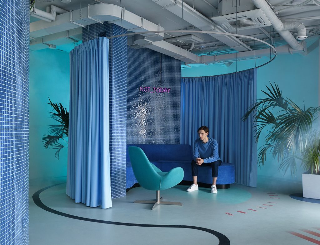 “Appodeal办公楼的内部概念在3个办公楼层,非工作地下室和开放式露台展开,并以每个楼层为自己的风格方向。大胆的色彩和材料组合,重点导航图形,宁静的私人岛屿和浅色中性空间的休息区被用来营造时尚,明亮和舒适的办公空间,“Studio 11说道。