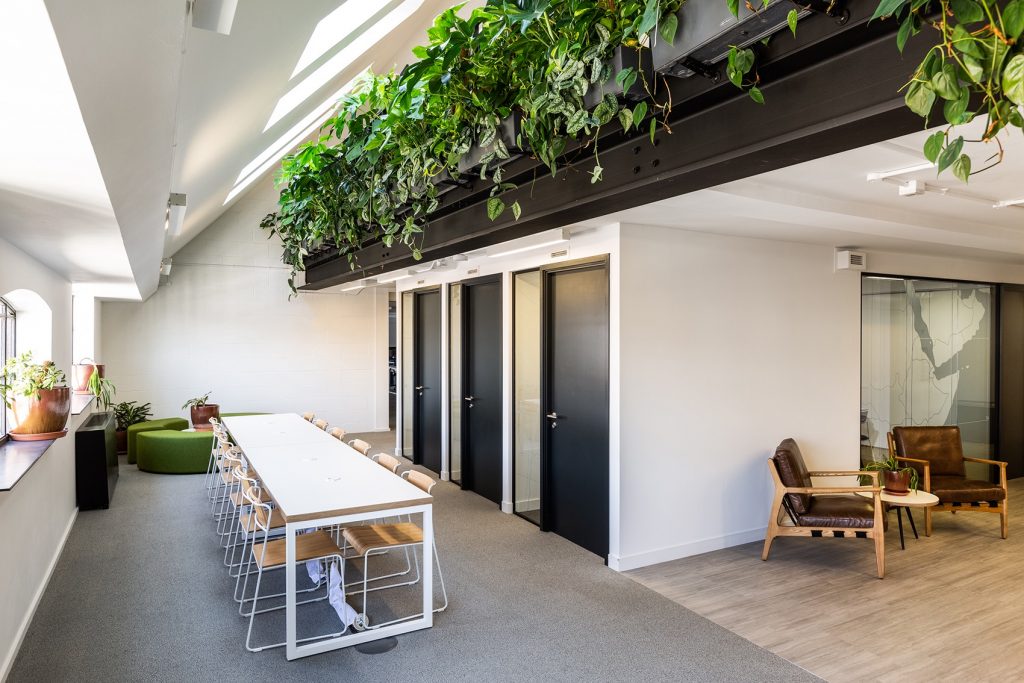 “简介是为员工的生活环境注入活力,确保他们了解公平贸易存在的原因,并通过创意设计回应慈善机构的声音和价值观。房子前面和会议室现在都非常关注公平贸易生产者网络中的人们的声音。这包括客户可以更新的空间,以显示各种商品材料,展示来自世界各地的生产商谈论他们与基金会的合作关系。此举旨在展示公平贸易产品,使生产商能够向贸易商和零售商销售产品。上层和下层设计用于占用永久性和温暖的办公空间,“电话亭”会议室可安静地工作或打电话,大型休息区和厨房。整个项目中最独特的部分之一是明亮的黄色会议室,其耸人听闻的悬挂式香蕉天花板 – 对公平贸易所做的工作的鲜明认可以及与其平静的环境形成鲜明对比的大胆色彩。通过公平贸易,消费者有能力每天改变世界。通过简单的购物选择,他们可以让农民获得更好的交易,并带领每个人应得的尊严生活。工作区内的定制涂鸦壁画将这一品牌信息带入生活,附近的会议室采用通过拍摄正宗咖啡袋打印而成的定制壁纸。玻璃隔断详细描述了地理主题表现形式,以突出公平贸易形成的全球关系。
