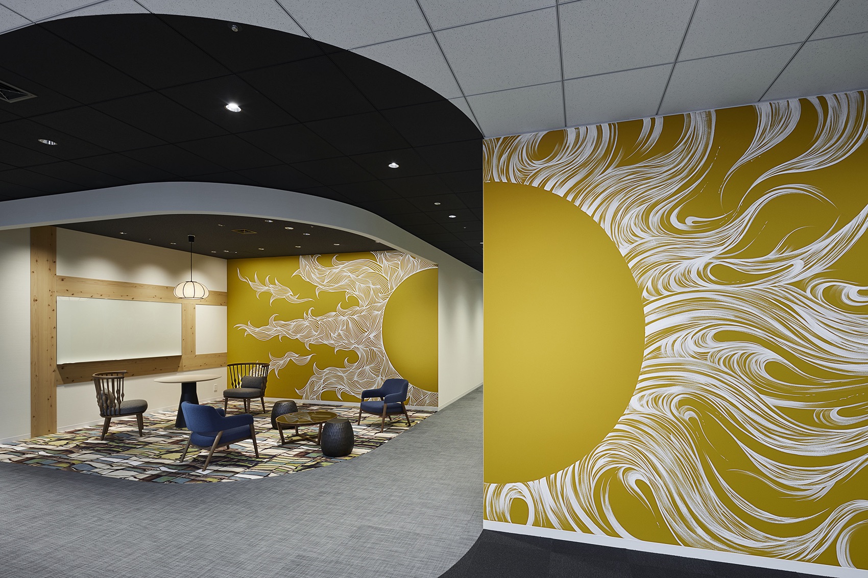 整个工作空间很大,但却被一系列“绿洲”元素所打断 – 小巧,宁静的工作和休闲区域,由许多景观,柔和的灯光和色彩所定义。这些绿洲空间和附近的休息区以明亮的彩色定制壁画为界,这些壁画也源自日本传统艺术和图形图案。它们共同提供了一条通过整个办公室的明亮舒适的地方。除了植物和壁画外,其他本地采购的材料也很普遍,包括榻榻米风格的地板和露台表面,日本雪松和柏树饰面,以及纸张照明灯具。